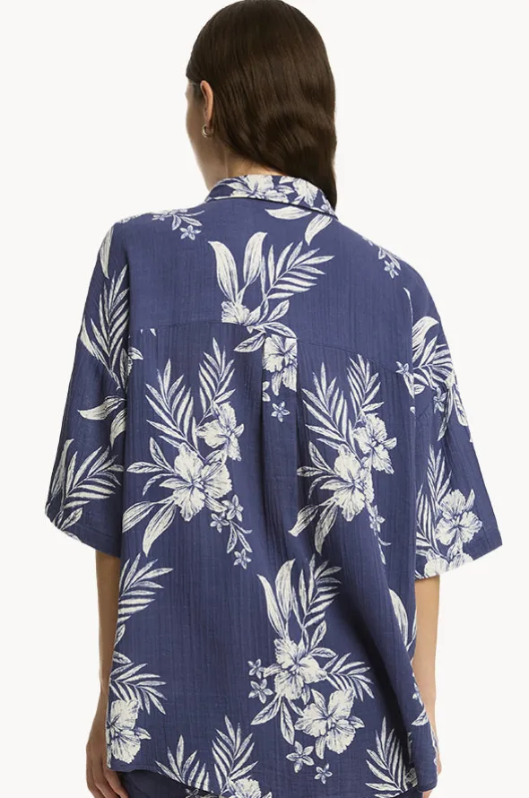 Sea Level Aloha Shirt in French Navy features a collared neckline, short sleeves, button through front, and has a relaxed oversized fit.