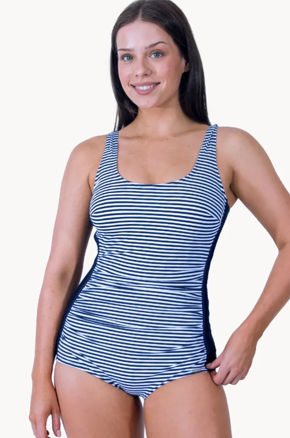 Jantzen Anchor Stripe Pintuck One Piece in Navy offers mastectomy pockets, soft cups, shelf bra, front powermesh, pintuck detail, best suited to A-C cup sizes.