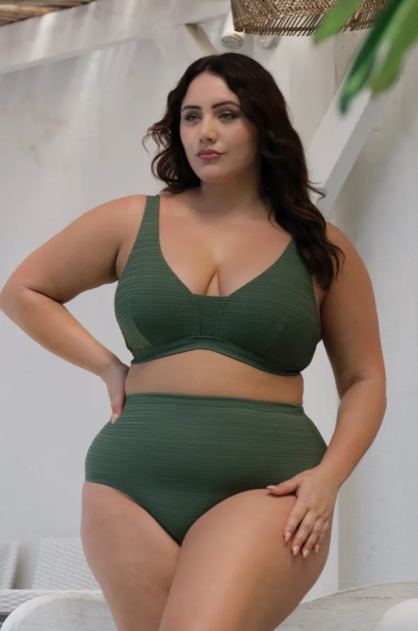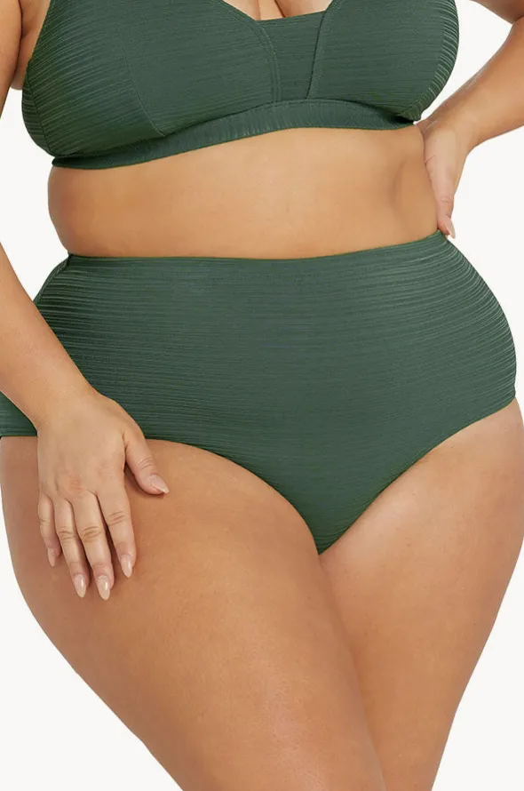 The Artesands Aria Renoir High Rise Pant in Olive features a supportive high-waisted fit, panel detailing for a sleek fit, and designed in sizes 10-24.