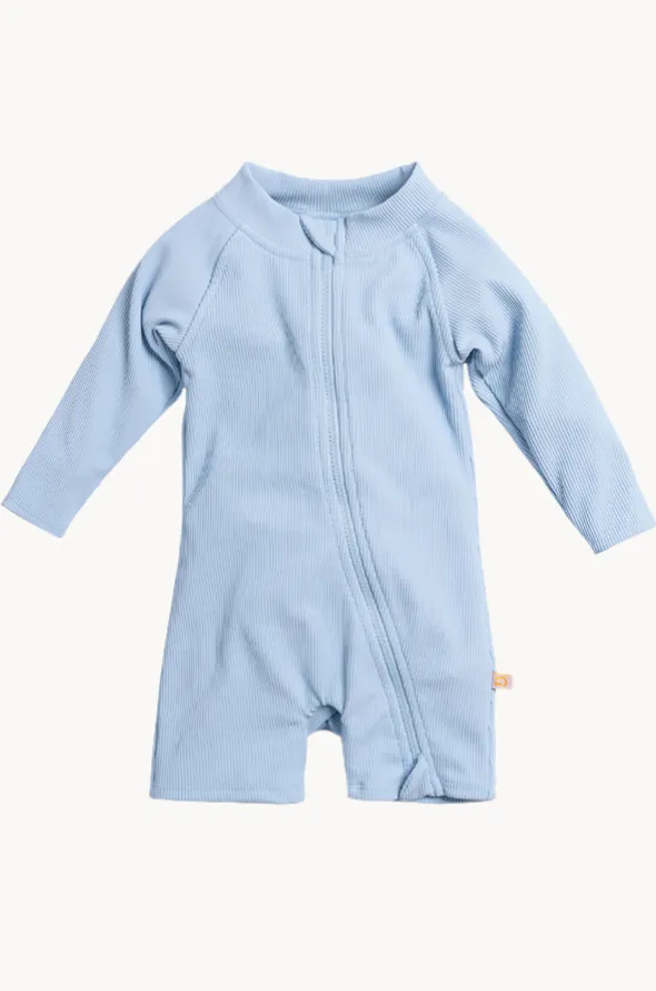 Tini Togs Baby Boys Zip Boyleg Sunsuit in Peacock offers long sleeves, sun protection rating, full length zipper, boyleg coverage, is available in sizes 0-3.