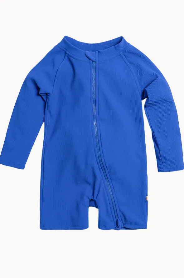 Tini Togs Baby Boys Zip Boyleg Sunsuit in Sailor offers long sleeves, sun protection rating, full length zipper, boyleg coverage, and is available in sizes 0-3.