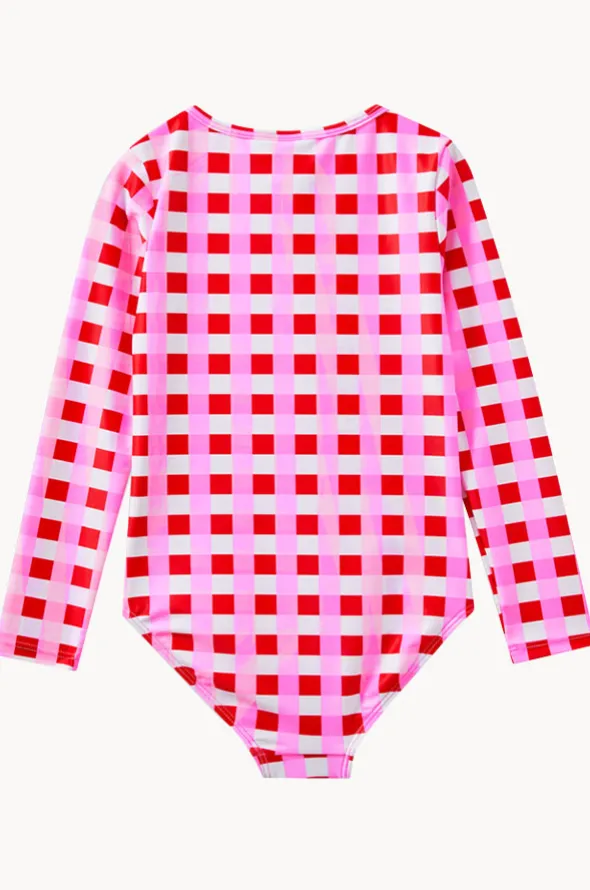 Milky Baby Girls Lollipop Check Sunsuit in Red/Pink features long sleeves, sun protection rating, front zipper, zip guard, and is available in sizes 00-1.