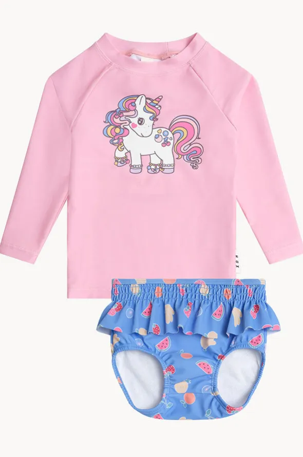 Huxbaby Baby Tutti Frutti Unicorn Suntop Set in Pink/Blue features a round neckline, long sleeves, sun protection, sustainable, and is available in sizes 1-2.