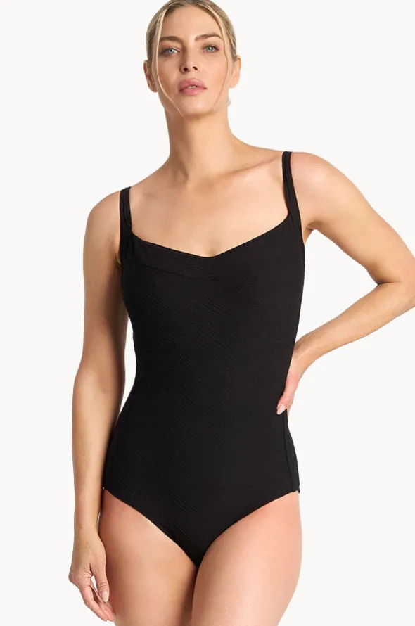 Poolproof Barbados F/G Cup One Piece in Black features underwire, shelf bra, adjustable straps, chlorine resistant, and is best suited to F-G cup sizes.