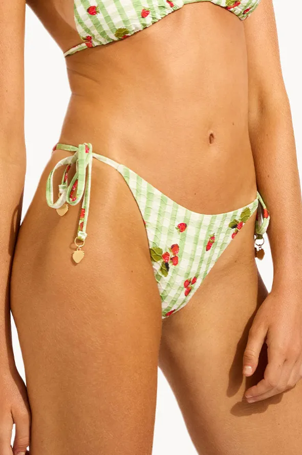 Seafolly Beach Picnic Tie Side Rio Pant in Sage features adjustable side ties, cheeky coverage, strawberry metal trims, lined, and is available in sizes 8-12.
