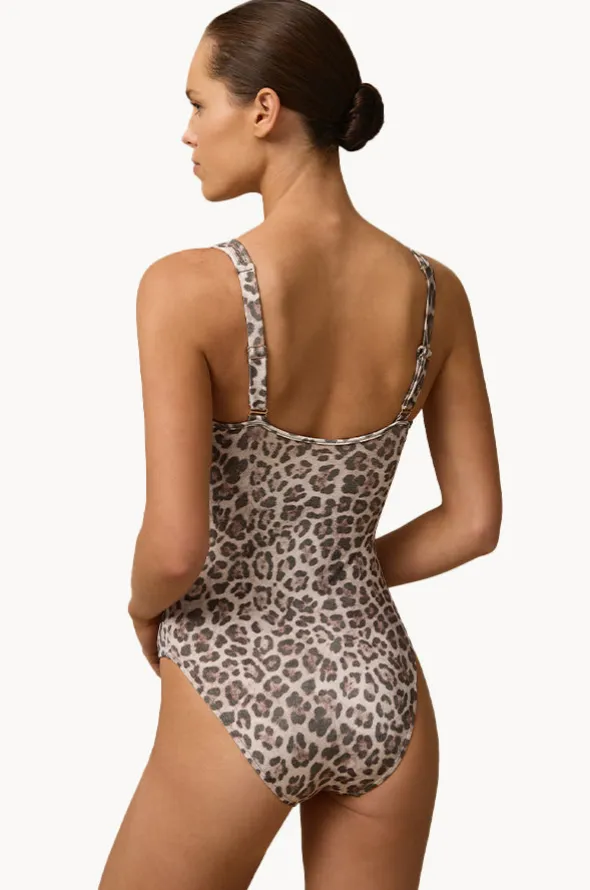 Monte & Lou Belle Multi Fit V One Piece in Animal features a V-shaped neckline, removable cups, adjustable straps, and is best suited to A-F cup sizes.