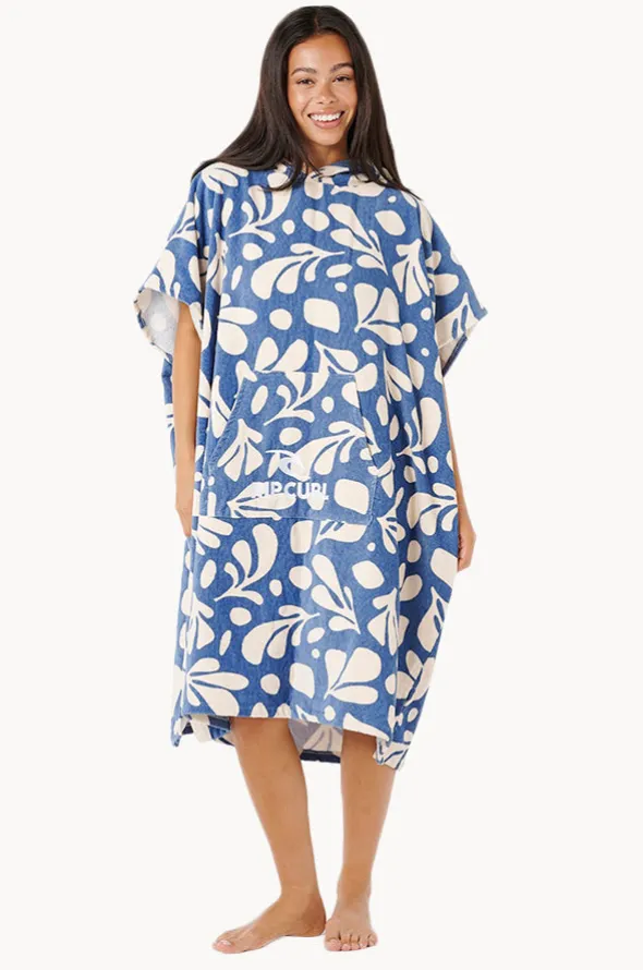 Rip Curl Blissful Mixed Hooded Towel in Blue features a hood, short sleeves, kangaroo pocket, absorbent fabric, and is available in O/S.