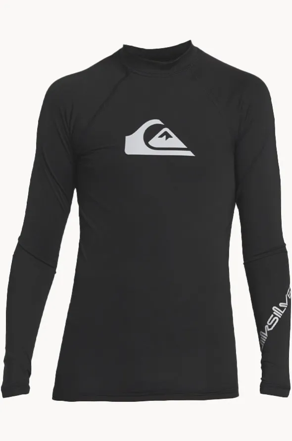 Quiksilver Boys All Time Long Sleeve Suntop in Black features a high neckline, long sleeves, sun protection rating, snug fit, and is available in sizes 10-16.