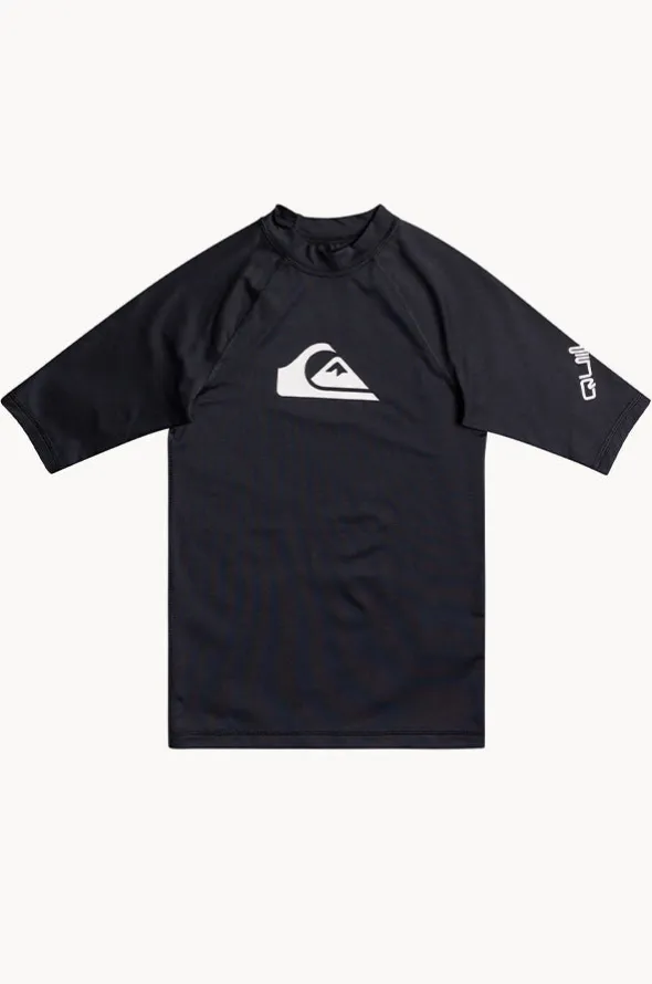 Quiksilver Boys All Time Short Sleeve Rashie in Black features a round neckline, snug fit, short sleeves, sustainable, and has a UPF 50+ sun protection rating.