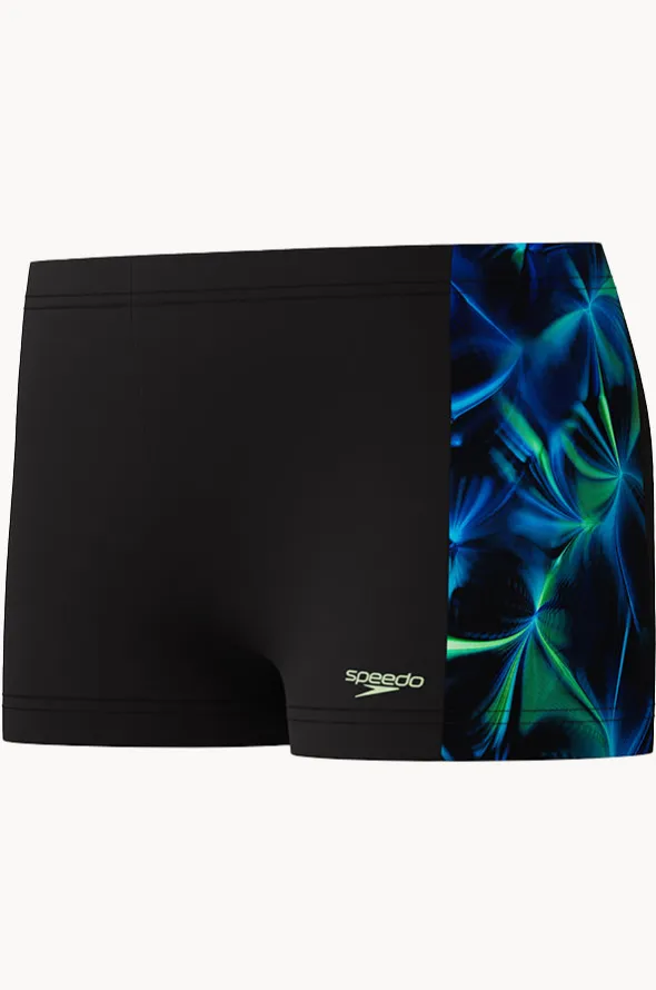 Speedo Boys Allover Print Panel Aquashort in Black/Green offers an internal drawcord, chlorine resistant thread, sun protection, and is available in sizes 8-14.