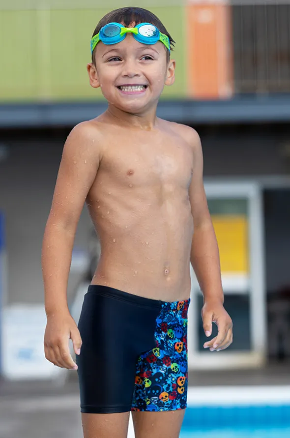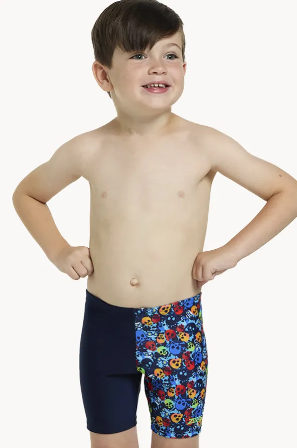 Zoggs Boys Bonz Midi Jammer in Navy/Multi offers a drawcord at waist, 25cm leg length, quick drying, 4-way stretch, sustainable, and is available in sizes 3-6.