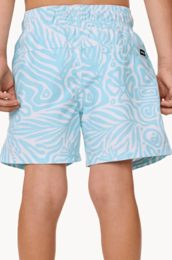 Rip Curl Boys Cosmic Surfing Volley Boardshort in Light Blue features an elasticated waistband, drawcord, embroidery detail, and is available in sizes 3-8.