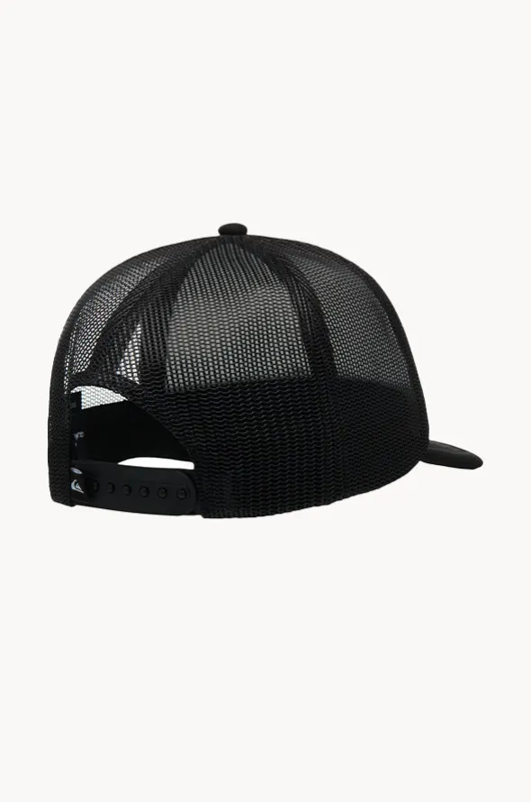 Quiksilver Boys Emu Coop Cap in Black/Blue features a trucker style hat, front patch, mesh panelling, adjustable back closure, and is available in O/S.
