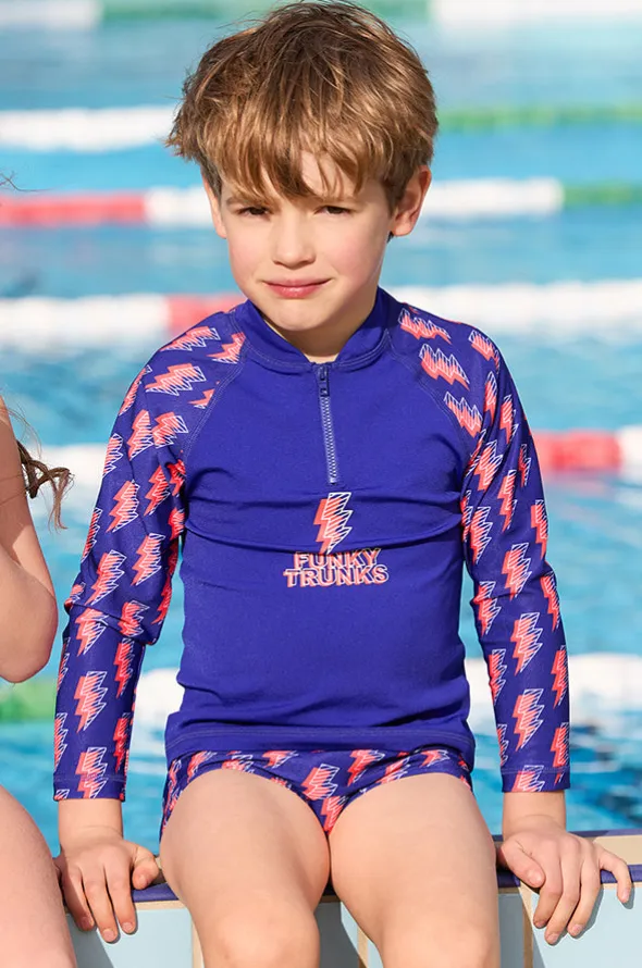 Funky Trunks Boys Flash Zippy Suntop in Navy/Red features a front zipper, long sleeves, UV 50+ sun protection rating, and is chlorine resistant.