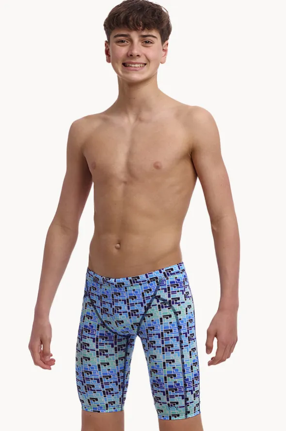 Funky Trunks Boys Frequency Jammer in Blue features an elasticated waistband, drawcord, flatlock stitching, sustainable and chlorine resistant.