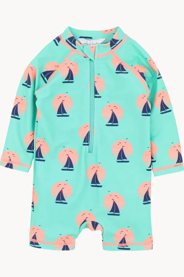 Minihaha Boys Jarvis Sunsuit in Green features offers sun protection, long sleeves, front zipper, sustainable thread, and is available in sizes 1-3.
