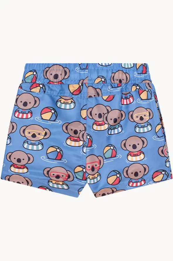 Huxbaby Boys Kel Koala Swim Short in Marine features an elasticated waistband, drawcord, sun protection rating, sustainable, and is available in sizes 3-6.