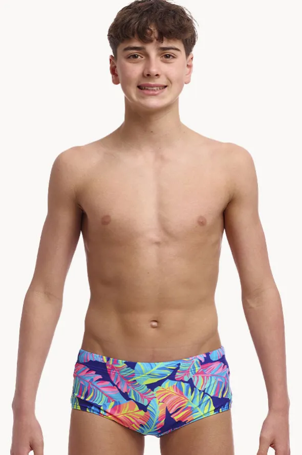 Funky Trunks Boys Leaving Today Trunk in Navy/Multi features an elasticated waistband, drawcord, front lined panel for modesty, and is chlorine resistant.