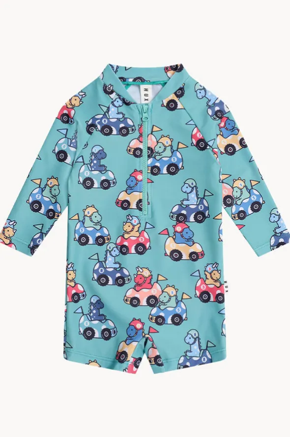 Huxbaby Boys Racer Dino Sunsuit in Green offers a round neckline, long sleeves, sun protection rating, front zipper, sustainable, and is available in sizes 0-5.