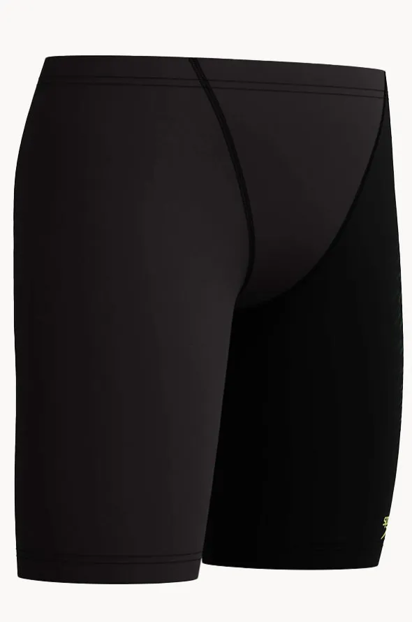 Speedo Boys Skull V Cut Jammer in Black/Green features an internal drawcord, V-cut front panel, chlorine resistant thread, and is available in sizes 8-16.
