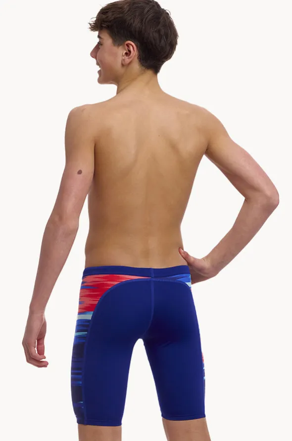 Funky Trunks Boys Storm At Sea Jammer in Blue/Orange features an elasticated waistband, drawcord, flatlock stitching, sustainable and chlorine resistant.