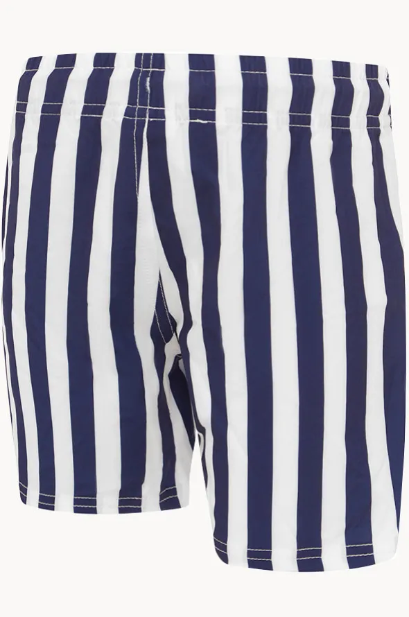 Speedo Boys Stripe Shorties Boardshort in Navy/White features an elasticated waistband, drawcord to secure, 4-way stretch, and is available in sizes 3-6.
