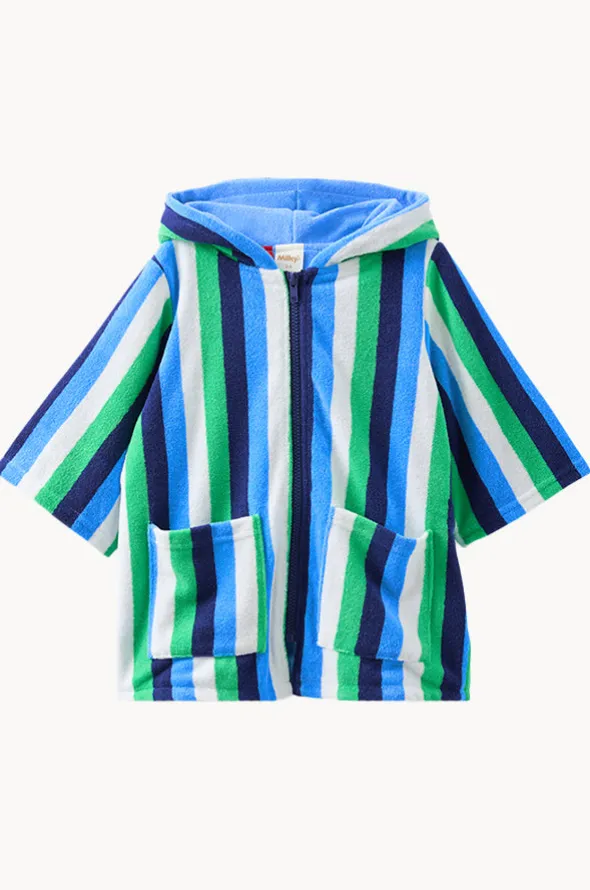 Milky Boys Stripe Terry Towel Cover Up in Green/Blue features a full length front zipper, long sleeves, front pockets, and is available in sizes 1-8.