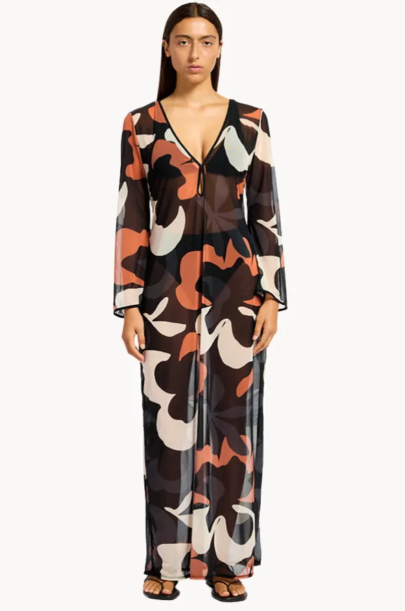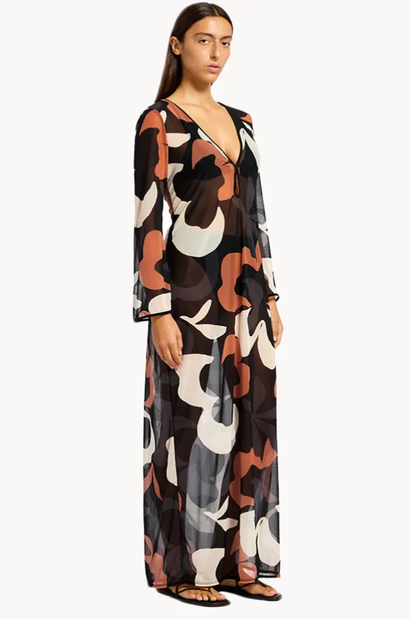 Jets Cactus Garden Mesh Cover Up in Black features a plunge neckline, maxi length, relaxed fit, mesh fabrication, and is available in sizes XS-M.