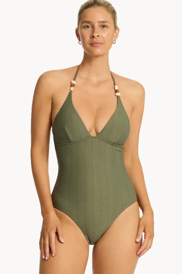 Sea Level Caracus Longline Halter One Piece in Khaki offers an adjustable halter neck tie, removable cup, sustainable thread, is best suited to A-D cup sizes.
