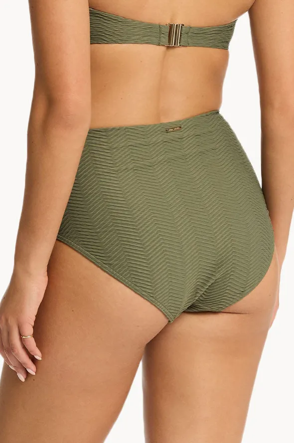 The Sea Level Caracus Panelled High Waist Pant in Khaki offers panelling detail, high rise waist, medium coverage, sustainable, designed for sizes 8-18.