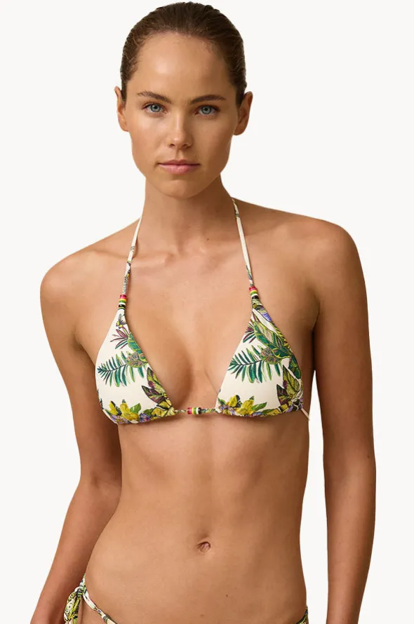 Monte & Lou Catalina Avoca Slide Tri in White/Green features a triangle shape, removable sliding cups, adjustable ties, and is best suited to A-D cup sizes.