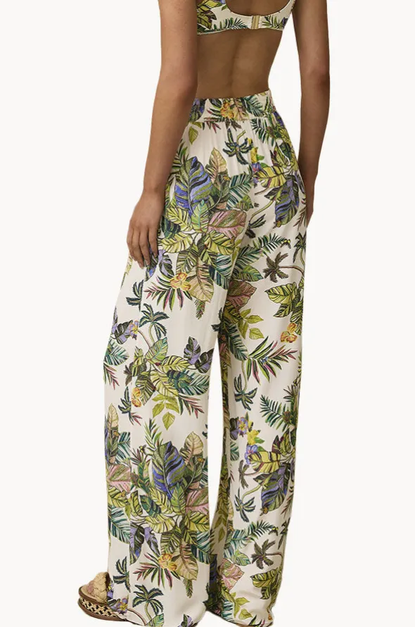 Monte & Lou Catalina Pant in White/Green features a high rise waist, elasticated waistband, drawcord, pockets, wide straight leg, and is available in sizes S-L.