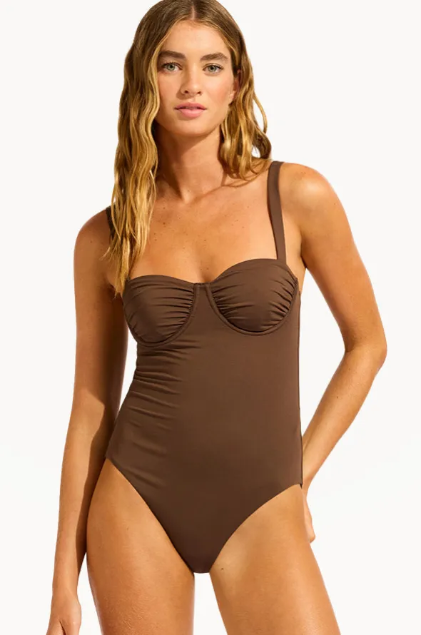 Seafolly Collective Ruched Underwire One Piece in Dark Chocolate features a sweetheart neckline, underwire, ruched cups, and is best suited to B-C cup sizes.