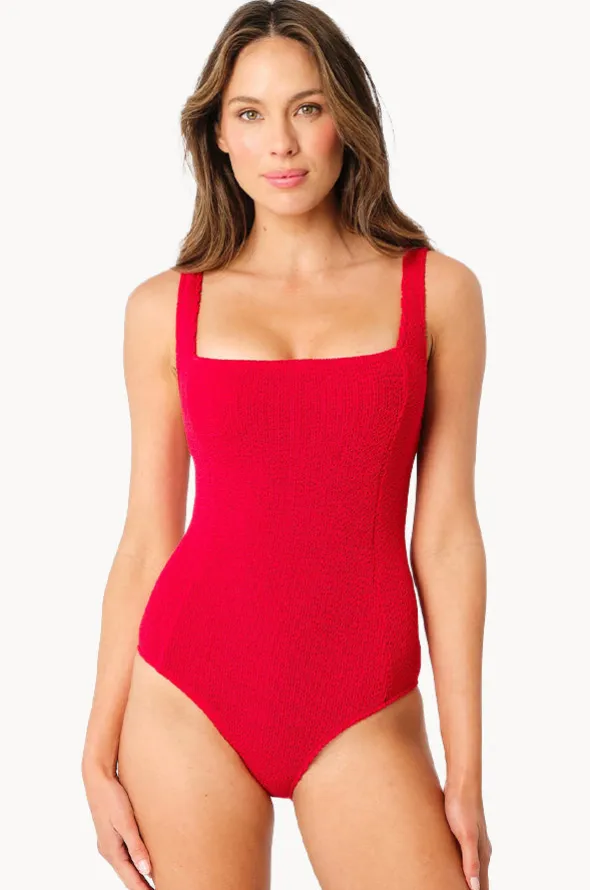 Une Piece Crinkle Classic Square Neck One Piece in Red offers removable bows on straps, removable cups, textured fabric, and is best suited to B-D cup sizes.