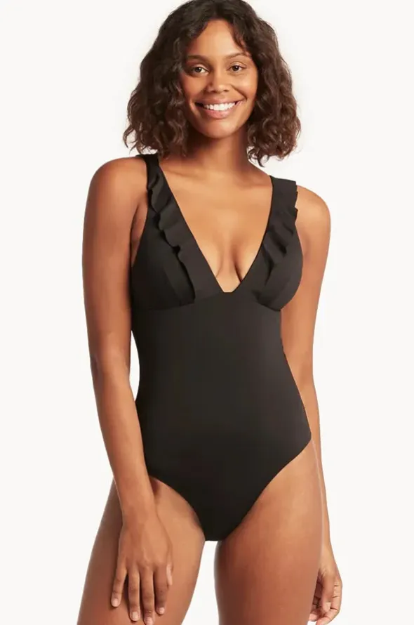 The Sea Level Eco Essentials Frill One Piece in Black features a plunge neckline, frill detail, removable cups, powermesh, and is designed for B-DD cups.