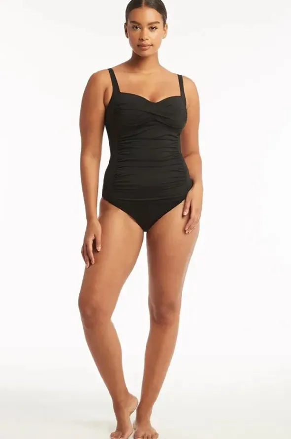 The Sea Level Eco Essentials Twist Front Tankini Separate in Black offers soft cups, adjustable straps, front ruching, powermesh, best suited to A-DD cup sizes.