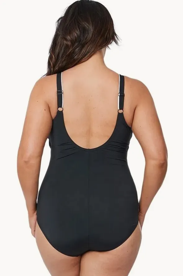Speedo Endurance+ Concealed D Cup Tank One Piece in Black/White features underwire, shelf bra, chlorine resistant thread, and is best suited to a D cup size.