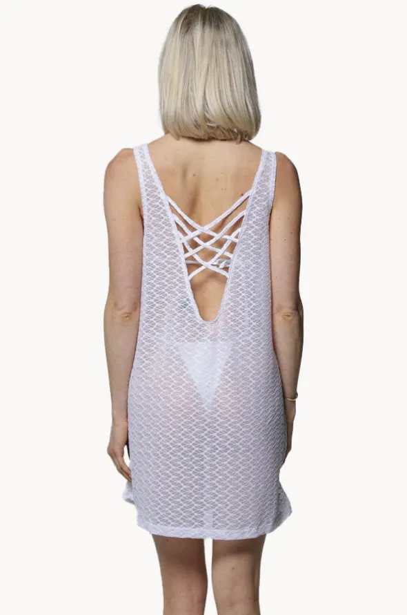 J’Valdi Escala Lattice Back Dress in White features a round neckline, wide fixed shoulder straps, semi transparent fabric, and is available in sizes S-XL.