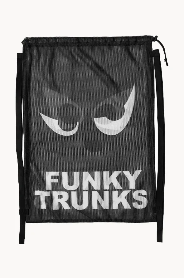 Funky Trunks Eye Spy Mesh Gear Bag in Black/White features dual shoulder straps, drawstring opening, durable when wet, mesh fabrication.