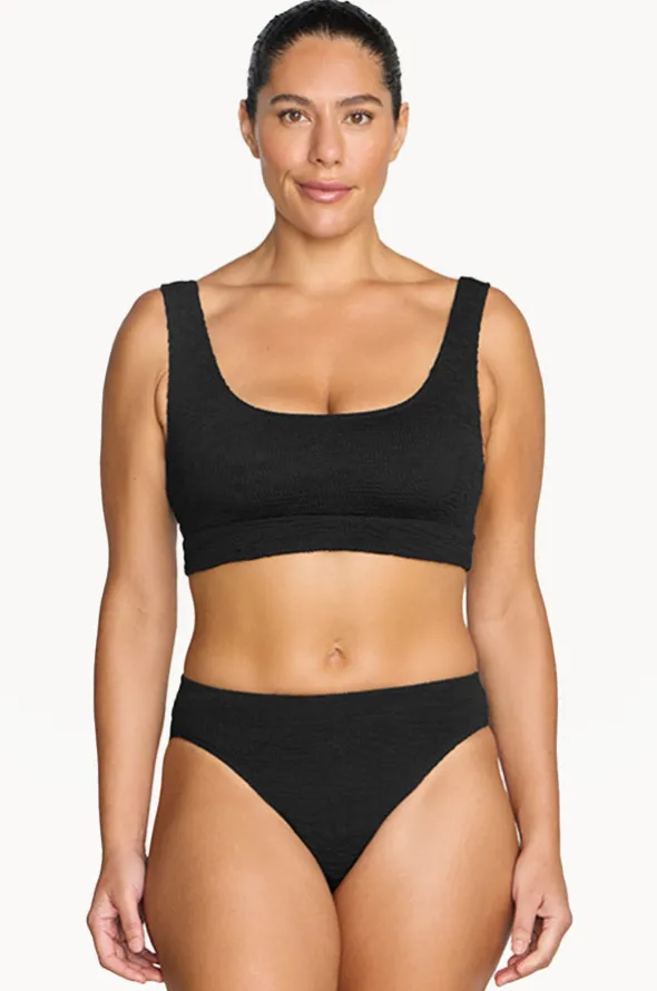 Artesands Folium Jacquard Kahlo Crop Set in Black features a crop top, scoop neckline, fixed straps, mid rise bottoms, and is best suited for sizes 12-22.