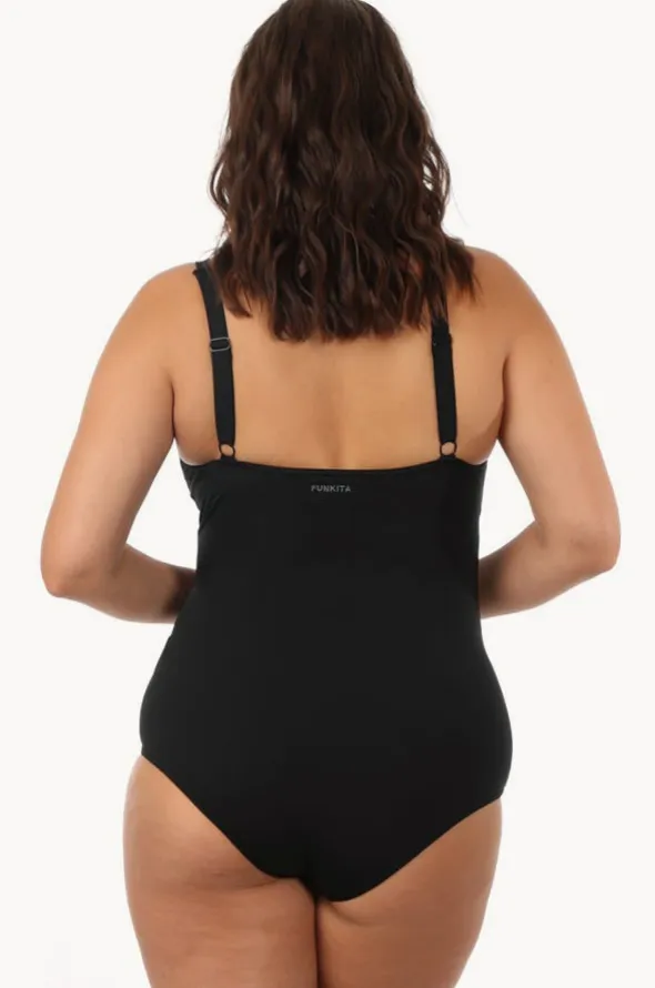 The Funkita Form Still Black Ruched One Piece in Black features a twist front neckline, powermesh, mastectomy pockets, shelf bra, suited to DD-E cup sizes.