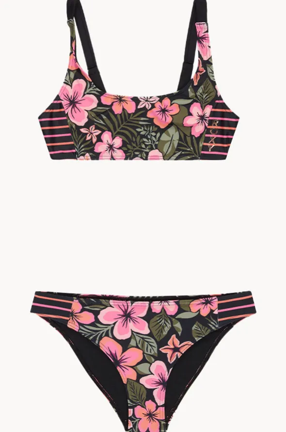 Roxy Girls Active Floral Bralette Set in Black/Pink features a bralette style top, adjustable straps, matching hipster pant, and is available in sizes 8-16.