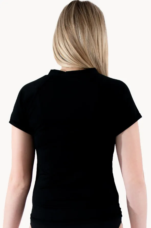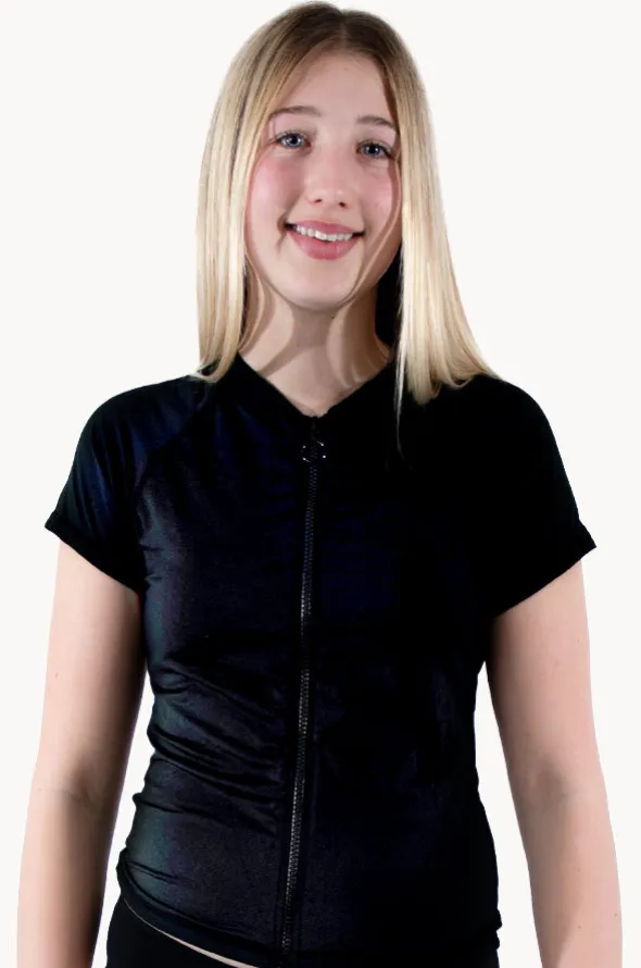 Base Swim Girls Cap Sleeve Rashie in Black features a high, round neckline, full length front zipper, cap sleeves, and is available in sizes 8-16.
