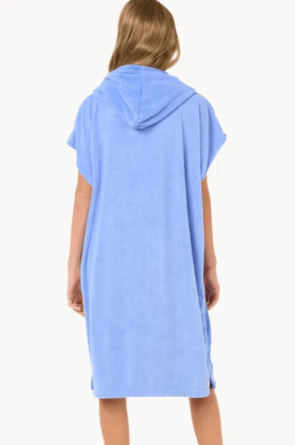 Rip Curl Girls Classic Surf Hooded Towel in Blue features a hood, Rip Curl embroidered branding, side splits, and is made from quick-drying Microfibre.