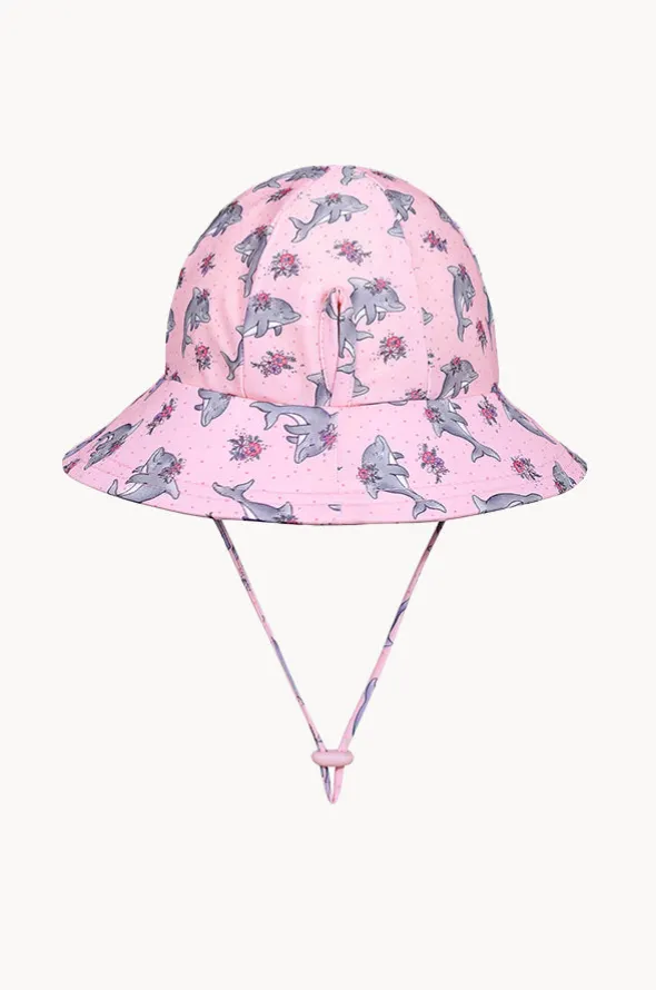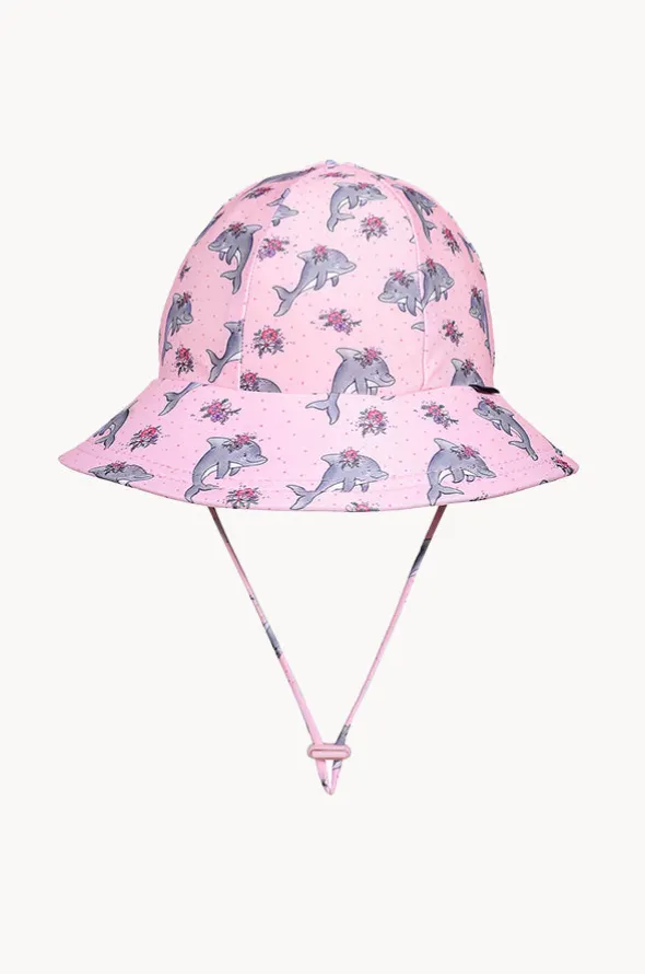 Bedhead Girls Dolphin Ponytail Bucket Sunhat in Light Pink offers an adjustable chin strap, sun protection rating, and has a return label for safe keeping.