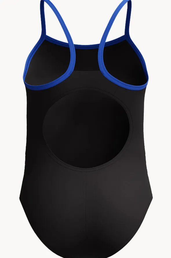 Speedo Girls Duo Logo Placement Thinstrap Muscleback One Piece in Black offers thin muscleback straps, 4-way stretch, sustainable, is available in sizes 8-14.