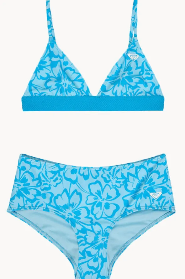 Roxy Girls Flaura Bico Tri Set in Blue features a fixed triangle top, adjustable straps, matching boyleg pant, and is available in sizes 8-16.