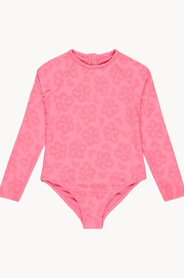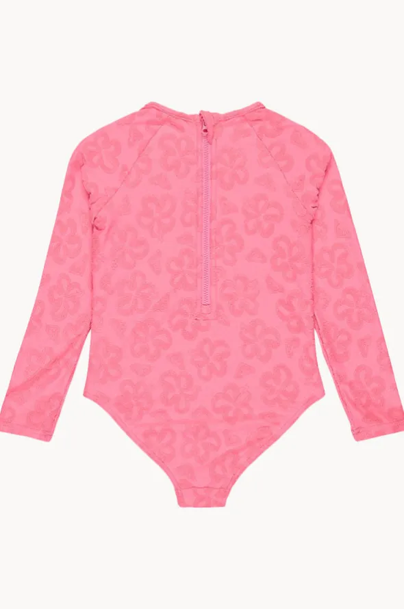 Roxy Girls Flip Flower Long Sleeve Sunsuit in Pink features a round neckline, long sleeves, back zipper, and is available in sizes 4-7.