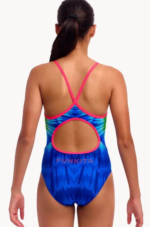 Funkita Girls Fly Time Diamond Back One Piece in Multi offers single bind shoulder straps, quick drying, chlorine resistant, available in sizes 8-14.