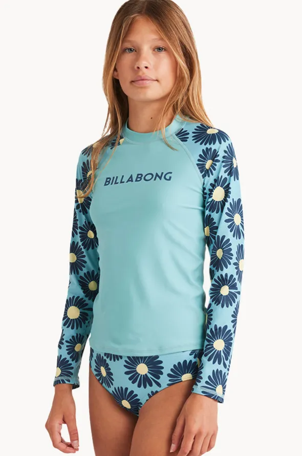 Billabong Girls Fresh Daze Suntop Set in Mist Blue features a round neckline, long sleeves, sun protection rating, hipster pant, and is available in sizes 8-14.